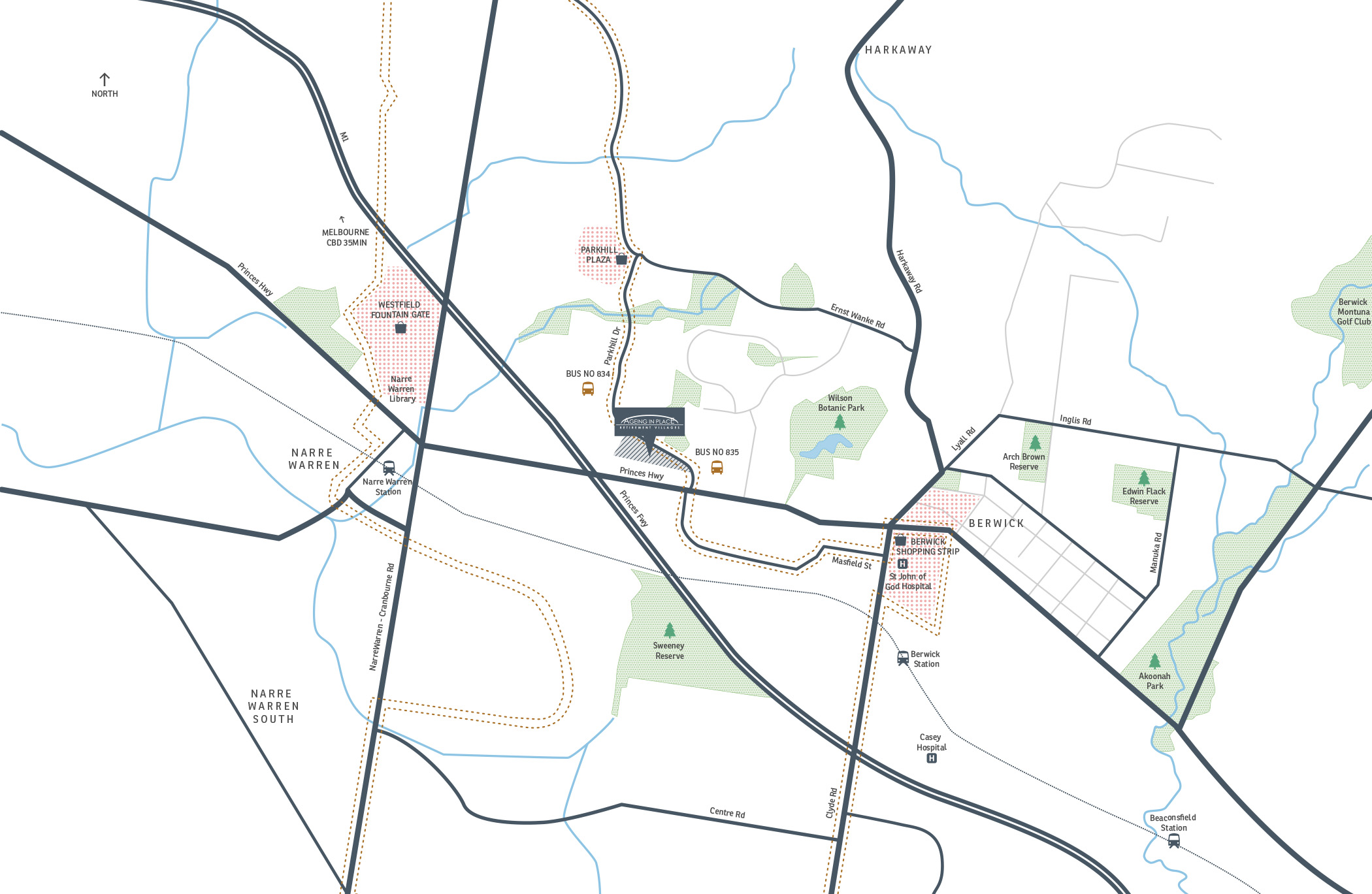 A signature Ageing in Place destination, Berwick’s Retirement Village is a progressive offering of 30 independent villas, nursing home and hostel all within landscaped surrounds. In a location dotted with parks and riverways, the boutique residential complex is just minutes from the established town centre of Berwick and Westfield’s ultra modern Fountain Gate Shopping Centre.